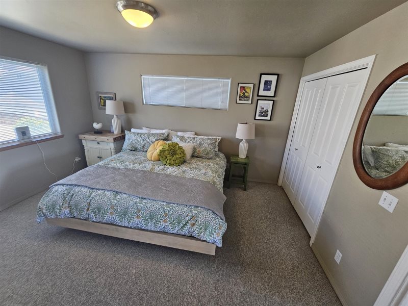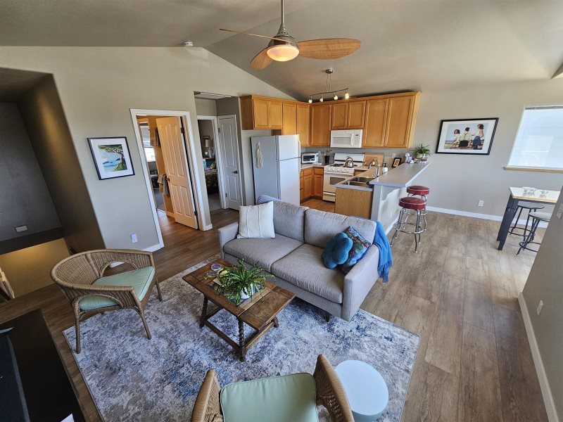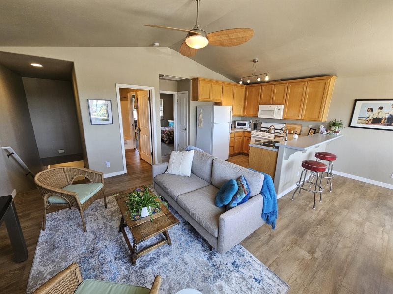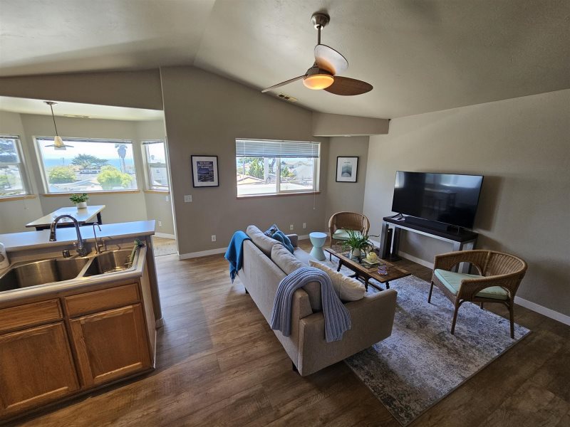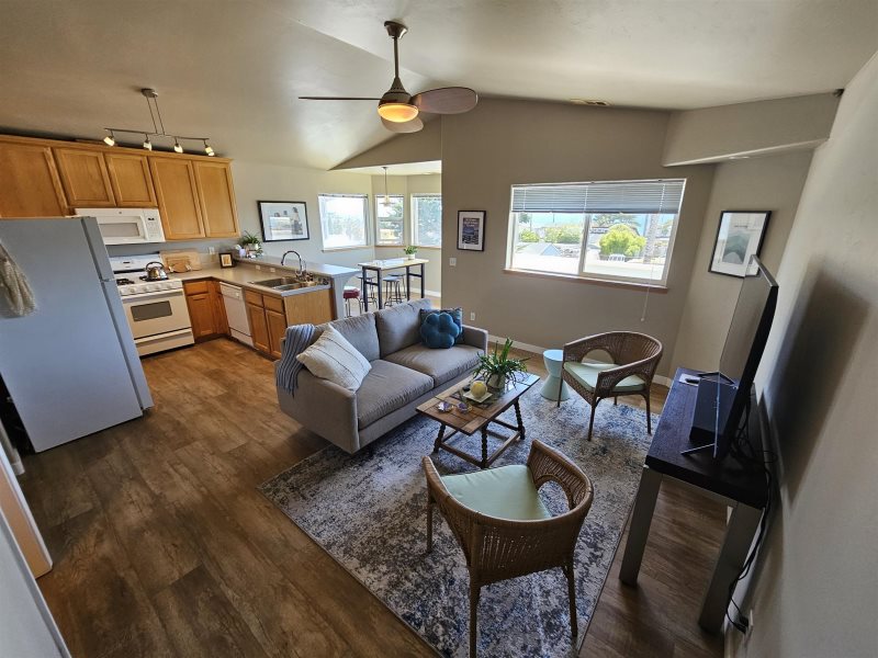 Escape to the heart of Cayucos and enjoy this beautiful second-story, one-bedroom apartment with sweeping ocean views. From the dining room, kitchen, and private balcony you’ll take in the sight of Morro Rock and the sparkling Pacific, the perfect backdrop for your coastal getaway. Inside, the spacious bedroom features a king bed and its own half bath, while the full bathroom offers a convenient tub and shower combo. Relax in the comfortable living area with a large couch and TV, or step outside to your balcony to sip morning coffee as the waves roll in.